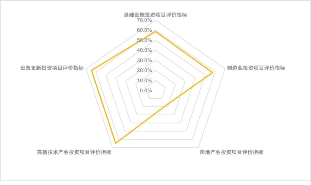 重点投资领域分指数包括基础设施投资项目、制造业投资项目、房地产业投资项目、高新技术产业投资项目和设备更新投资项目5个具体评价指标。其中基础设施投资项目评价指数为58.6%,制造业投资项目评价指数为57.4%,高新技术产业投资项目评价指数为64.9%,设备更新投资项目评价指数为64.5%。反映参调单位认为三季度基础设施项目和制造业项目的固定资产投资持续增加,高新技术产业项目和设备更新项目的固定资产投资增速保持较高水平。