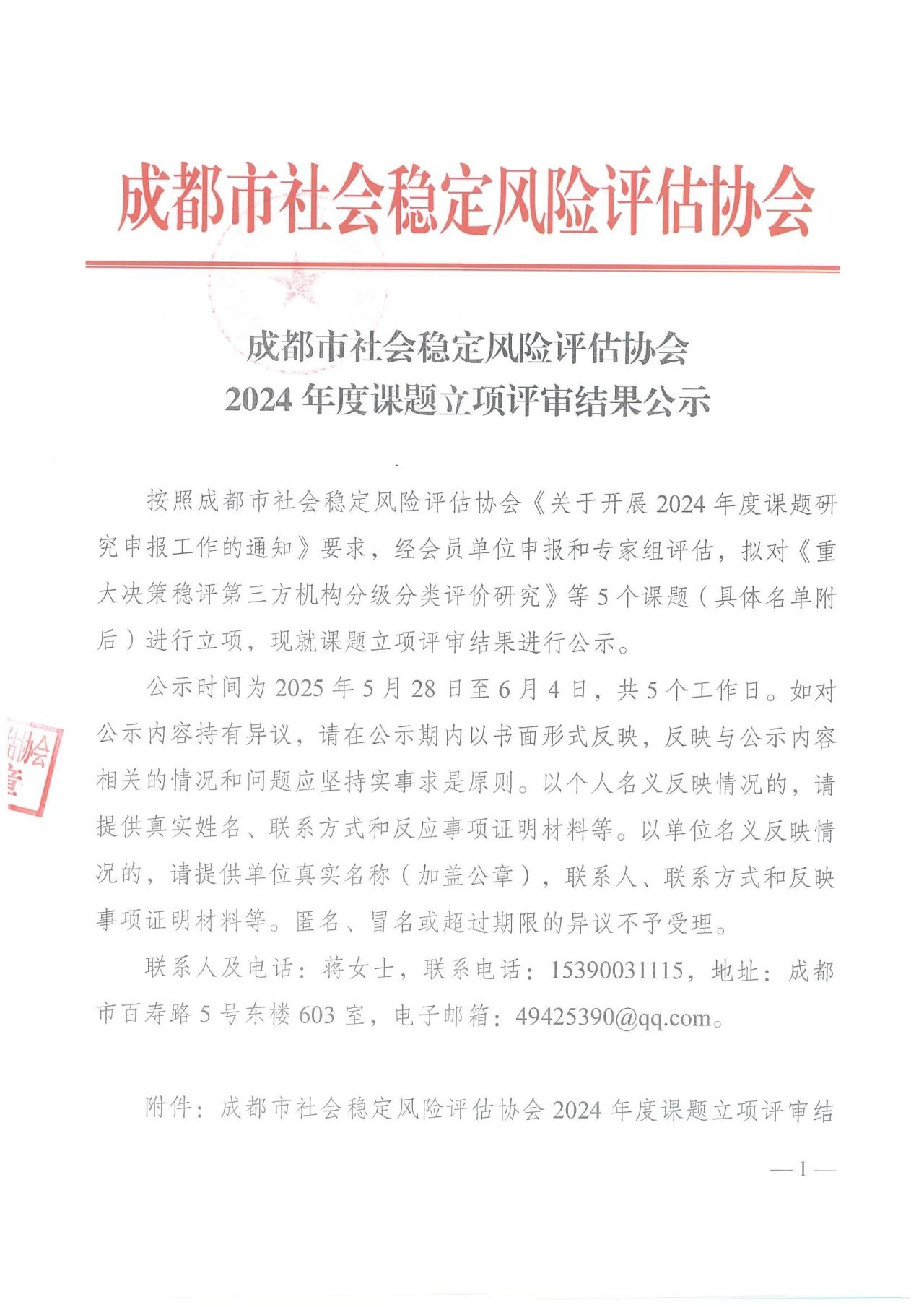 成都市社会稳定风险评估协会2024年度课题立项评审结果公示