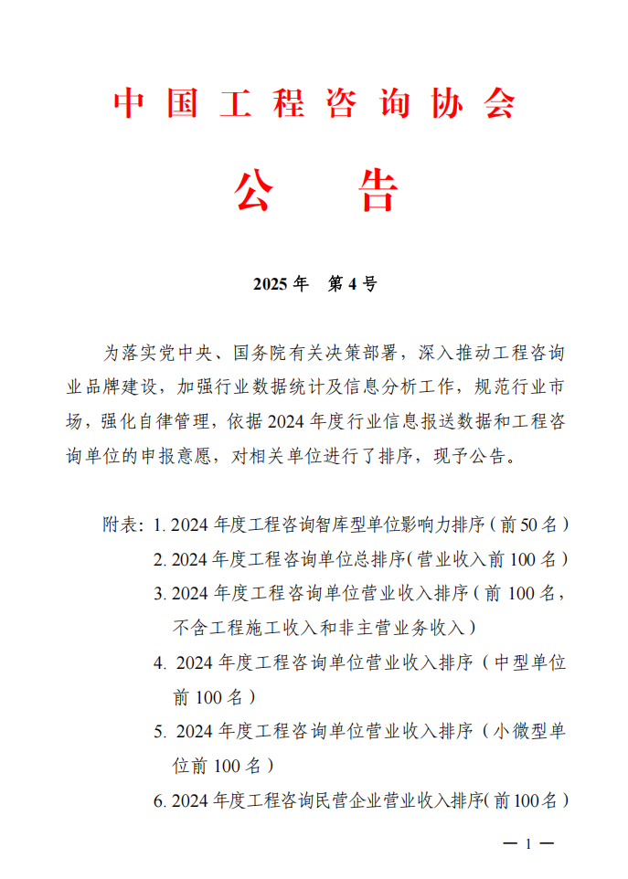 近日,中国工程咨询协会公布了“2024年度工程咨询行业智库型单位影响力排序(前50名)”名单。开云(中国)Kaiyun·官方网站开云(中国)Kaiyun·官方网站首次入选榜单,位列第46位。